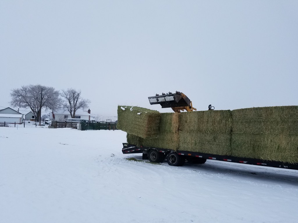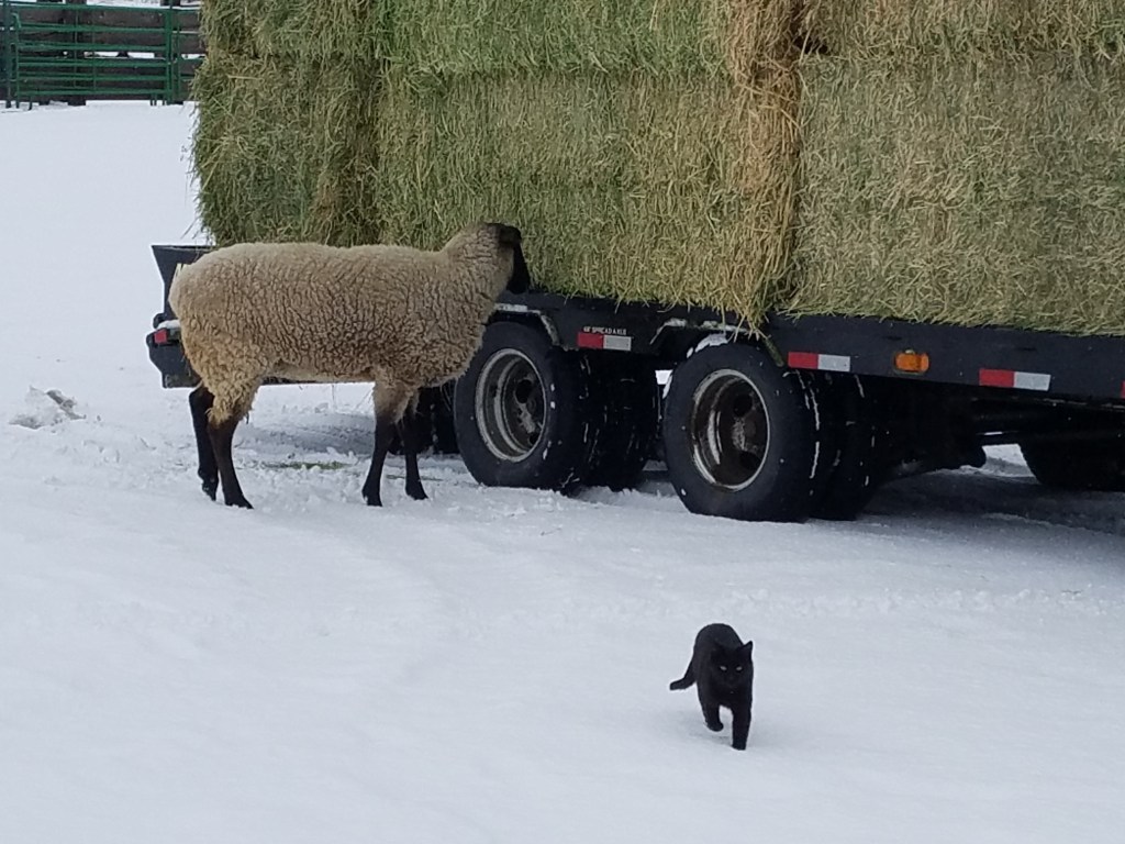 About every 10 days we purchase hay for the livestock. Mostly for the cattle, but L the Sheep gets to ‘free range’ on the bales, goats get what falls off in the process of feeding the bulls (they don’t get a whole bale) and the chickens get to play in the dregs if they feel brave venturing across the snow into the barnyard. With the eagles out over in the Long Field the chickens don’t wander any farther than the coop yard.