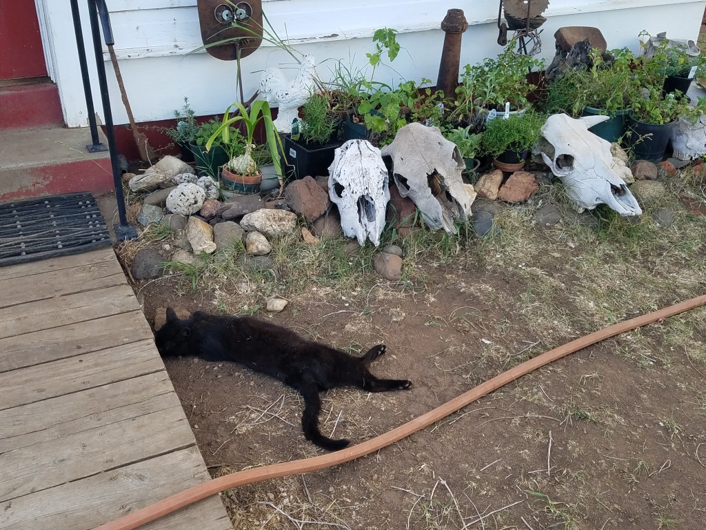 Oh, and we’re always on the hunt for goatheads (puncture vine) or thistle. Not as many goatheads as the years go by and the only way to get rid of those is to pull them. Thistles, we chop and cut the heads off if they bloom but this year they aren’t looking all that good because of the high temperatures and there are a couple of new spots where the fire went through that has allowed a rash of them to pop up. Not always a fun task but it needs to be done.
