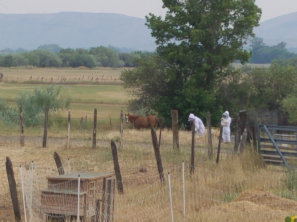 Bees need to be checked and fed. Excuse me… feed bees? Why on earth would you feed bees when there is blooming alfalfa crops and sunflowers all over the place? Because this time of year, when there is a lot of heat and is called the ‘summer nectar dearth’ when there is not many flowers because of the heat. A lot of the blooms this year have been cooked from the heat and hot winds. So to keep the bees happy we feed them a little syrup to get through this heatwave as they prepare their hives for winter. They are also getting a little waspy, too, from the heat.