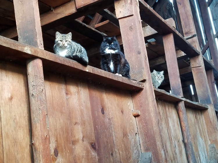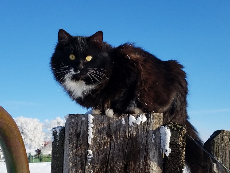 Mittens…. he’s one of several barn cats that patrol the compound and keep the rodent population in check. We love all our barn cats but he is a little more …. well, he’s quite the character and has a few nicknames. He gets called a ‘land slug’ in the wintertime (because you can’t see his legs in the snow… he just appears to glide along with his tail outstretched in dramatic fashion), or ‘Mittens the Menace’ when he is pestering the other cats, especially Opal just to make her snarl and growl.
