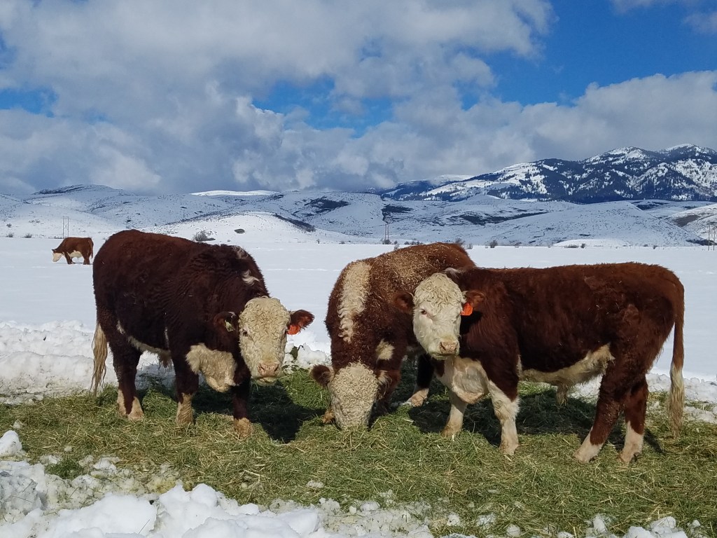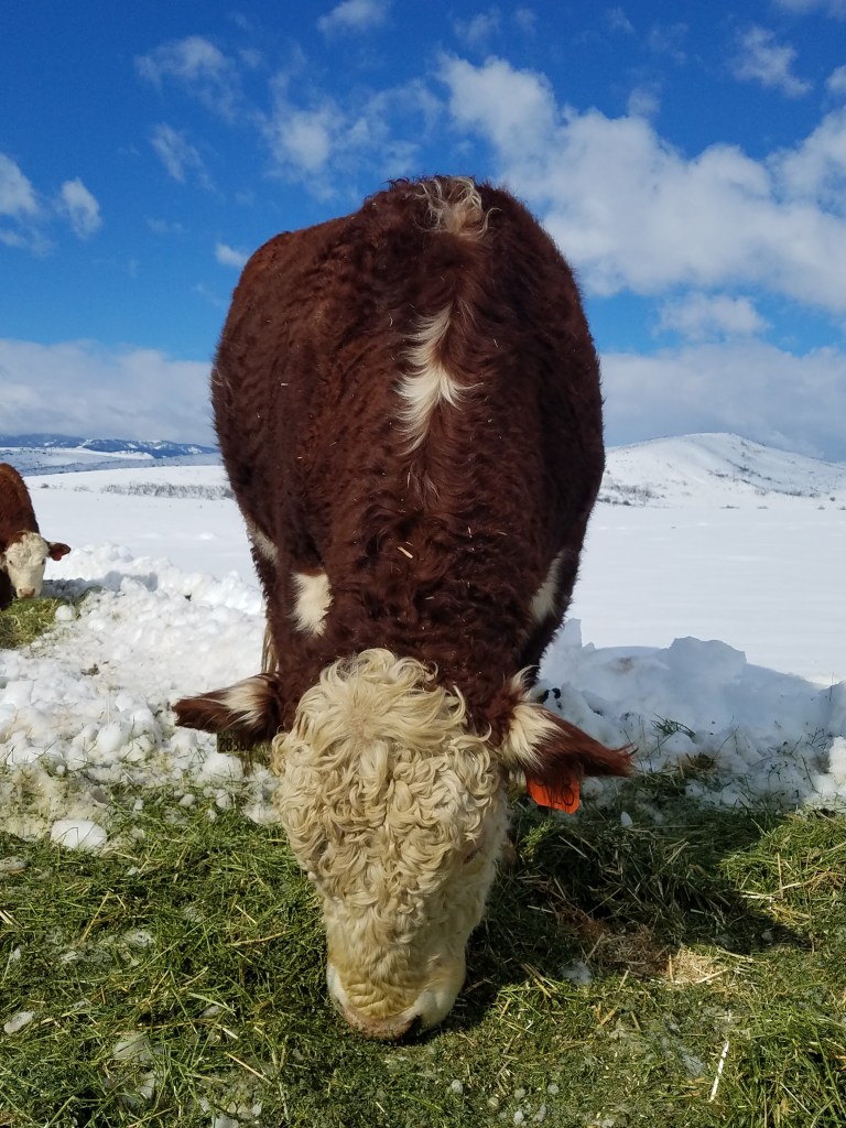 Hereford cattle are the breed that built the West. They are hardy animals that can tolerate our cold temperatures, poor feed quality, have structural soundness that is capable of handling the rough terrain, great mothers, excellent breeders and have a very calm disposition. The latest fad is to cross breed them with Angus cattle for ‘hybrid vigor” with the idea that it will increase your profit margin. Why, when you already have the ‘vigor’ of the Hereford? Is it because feedlots don’t like Herefords because they don’t require special maintenance or diets to gain weight and outperform other breeds? Is it possible that feedlots don’t like them because they can’t pump tons and tons of grain into them for extended amounts of time before they are ready for processing? Herefords are quite efficient feed converters – meaning if you own your own feedlot, it won’t take a long time to fatten up those Herefords as compared to other breeds. Feedlots would loose money and most feedlots are own by corporations who grow and/or own grain facilities. The longer they feed, the more money they make off the producers who put their cattle into those lots to fatten them up.