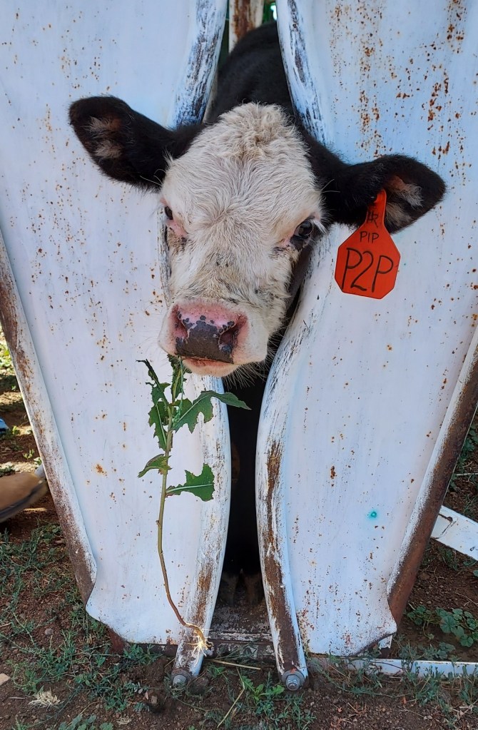 The first volunteer was Squeak. His mama is PIP the Angus. He’s our first baldy calf and he was bound & determined NOT to loose his snak of prickly lettuce he found in the alley. All through getting squeezed, shaved, a 23-second freeze brand, green tattoed ears & a multi-min shot he never jumped, squirmed, complained or drop his prized snak. And he was very proud of himself, too. Soon they were all done and moved out of the way for the next batch.