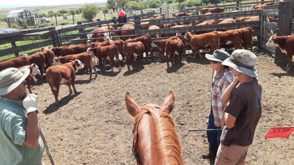 The 2023 calves are now the cool kids on the block. They’re styling with the latest trend amongst young cattle their age. Green ears, simple tattoos and radically cool hair cuts. The day began with a morning roundup, calves sorted away from mom and us getting some stuff set in place since it was going to be a day-long event in the sun, dust and whatever else flung our direction. Sometimes calves need a little encouragement to go down the alley (the story-telling heifers blabbed it was scary with spooky shadows) so we tried a cover to get rid of the shadows created by the sun and boards. This corral & alley system is from the hobbit era, designed by hobbits. Anyone over 5 feet tall will suffer a concussion at some point(s) during the day. You’ll note the boards going across the alley under the shade screen, which worked, by the way, eliminating shadows. Didn’t eliminate the whacks to the noggin’ though…